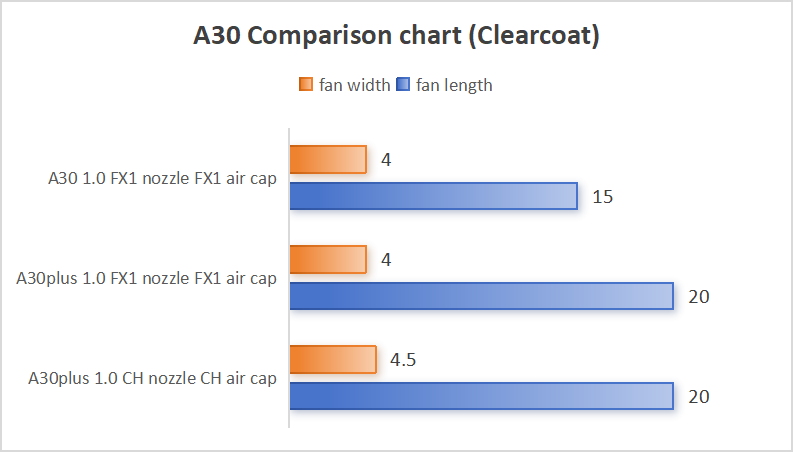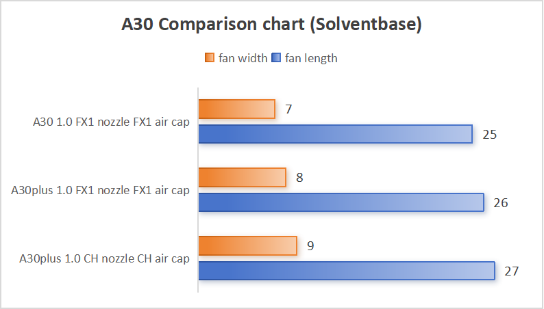 These enhancements are built into the complete A30plus system design. As a result, the original A30 cannot achieve the same performance level — even when using similar nozzles or air caps.